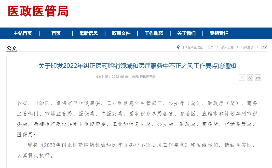 近日,国家卫生健康委员会、工业和信息化部、公安部、财政部、商务部、国家税务总局、国家市场监督管理总局、国家医疗保障局、国家中医药管理局等九部委联合印发了《关于印发2022年纠正医药购销领域和医疗服务中不正之风工作要点的通知》(以下简称《通知》)。